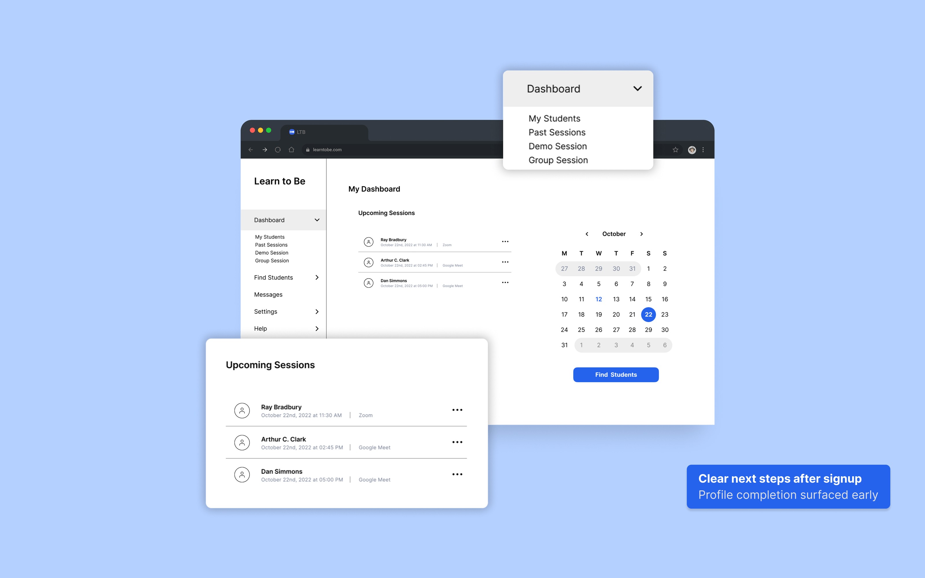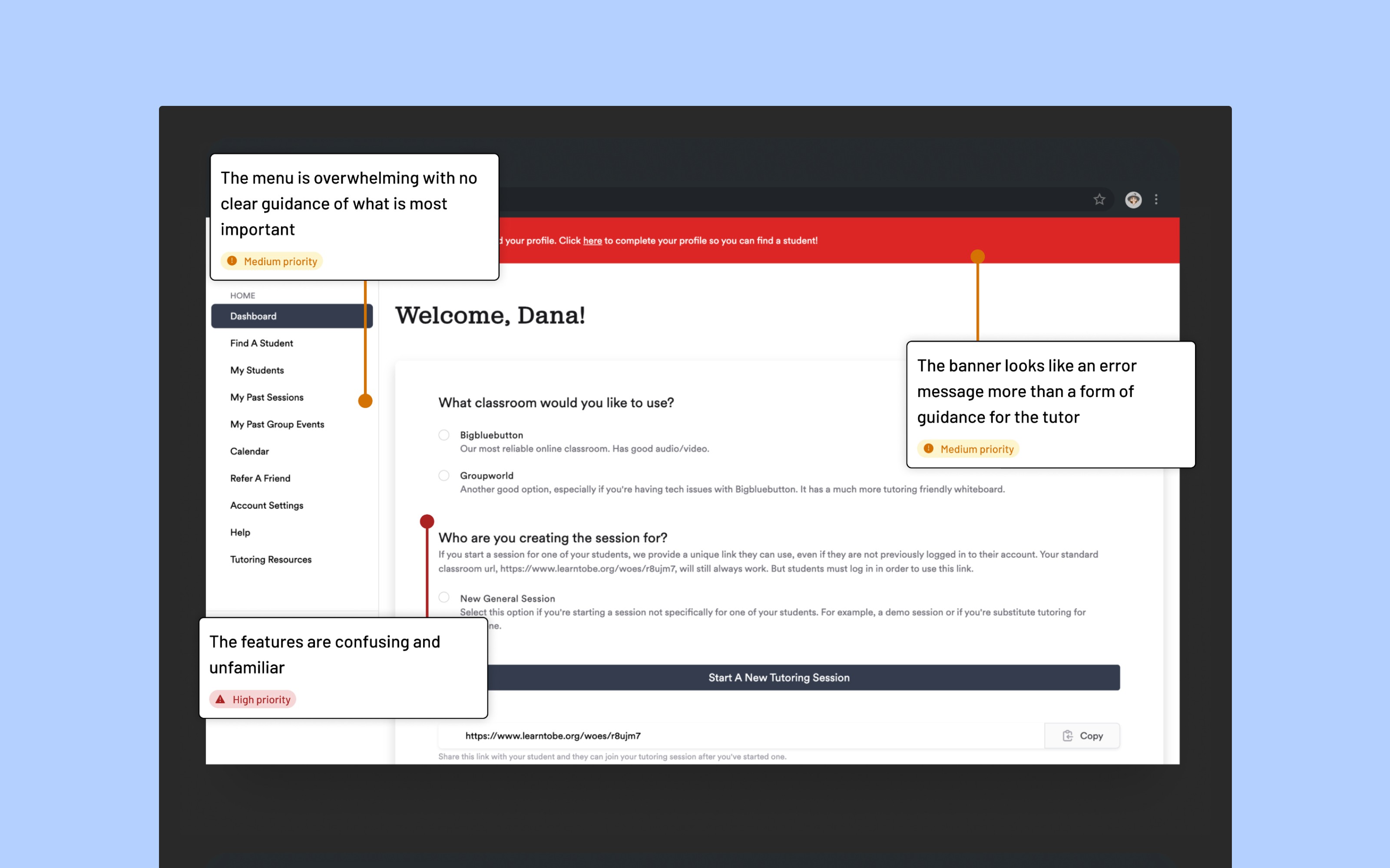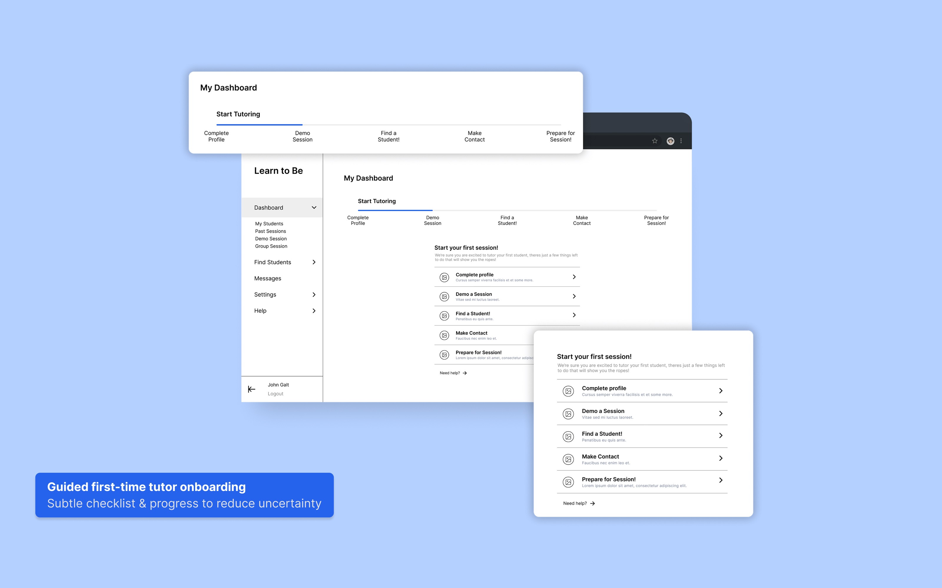 As Learn To Be scaled, new tutors were dropped into a dashboard without clear next steps. Profile completion requirements were not communicated clearly, delaying student connections and increasing early drop-off. Activation stalled before tutors reached their first meaningful action.