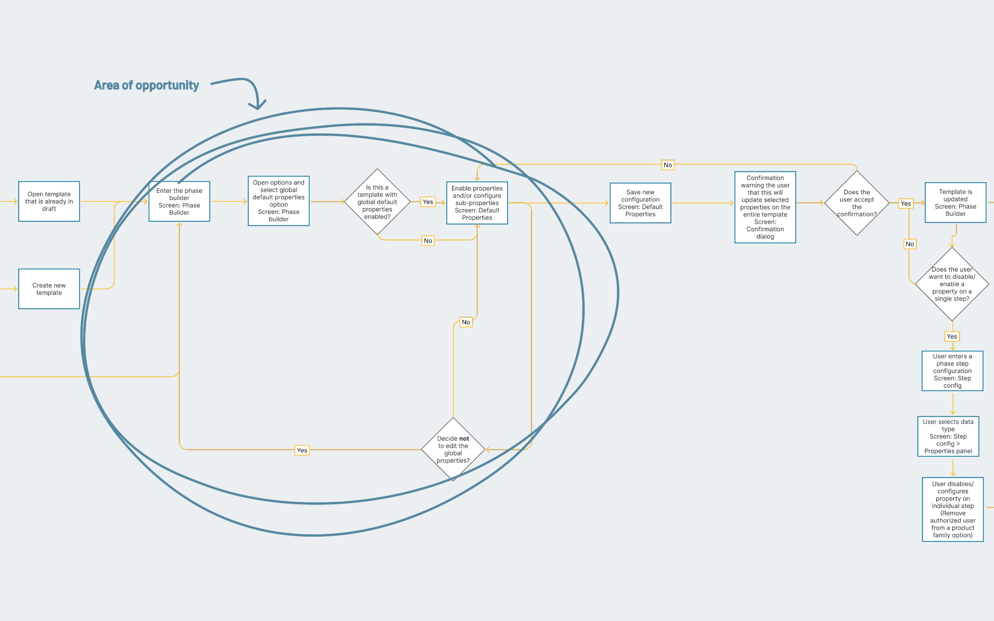 Flow mapping revealed that placing global property configuration early in the journey reduced downstream rework and gave builders template-level control before committing to individual steps.