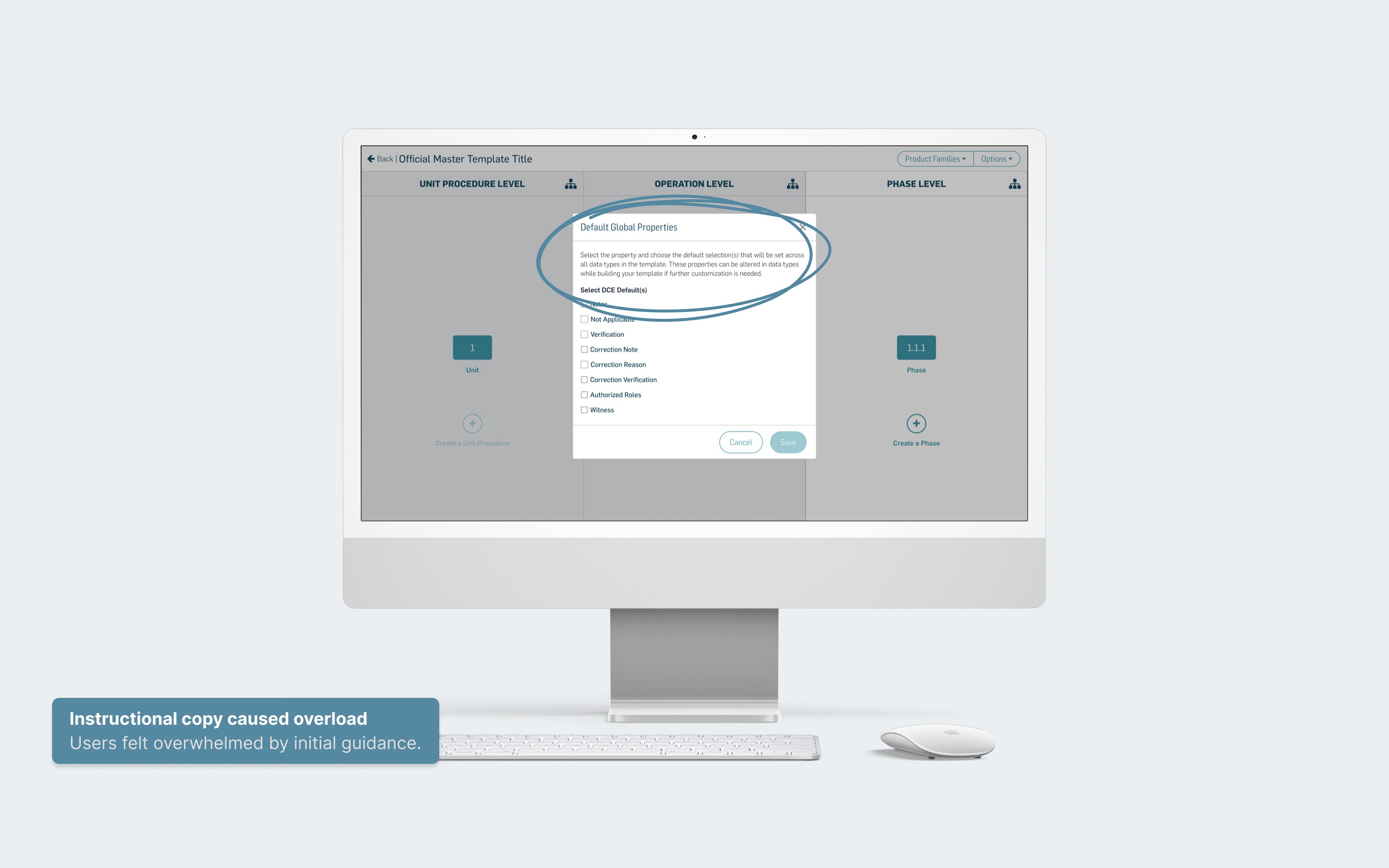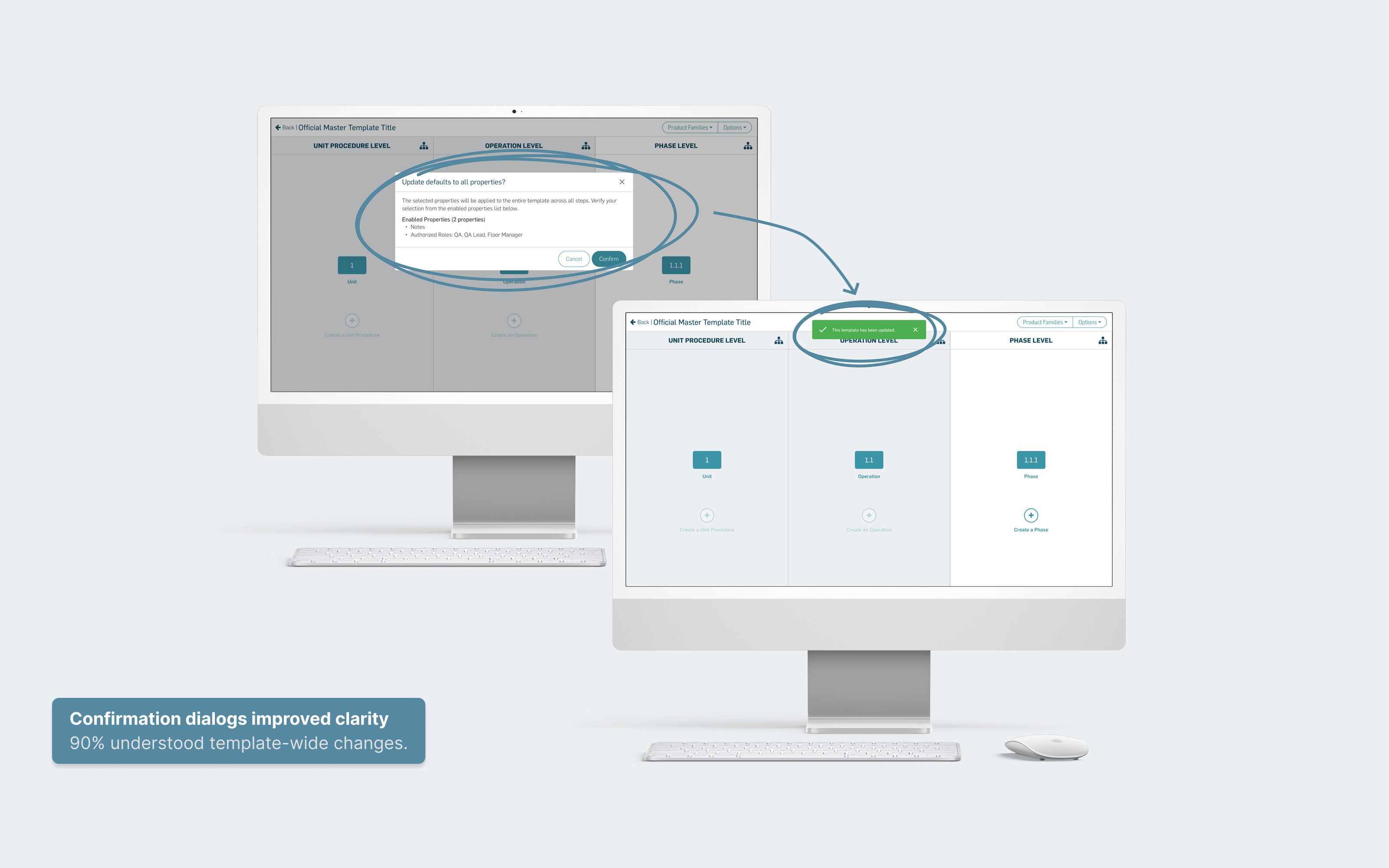 Usability testing revealed initial information overload, so instructional copy was revised with UX writing and paired with stronger confirmation dialogs and notifications to make system-wide changes explicit—adding a critical safety layer for regulated teams.