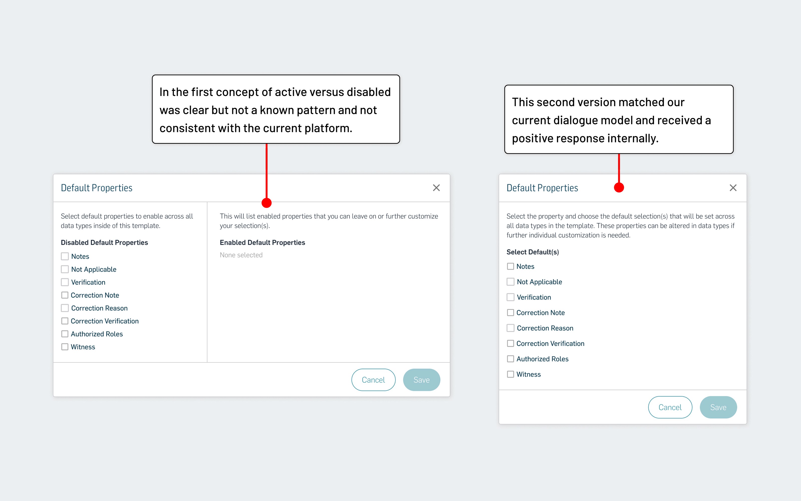 The first concept introduced an active versus disabled pattern that was clear but unfamiliar. The second matched the platform's existing dialogue model and received immediate positive response internally.